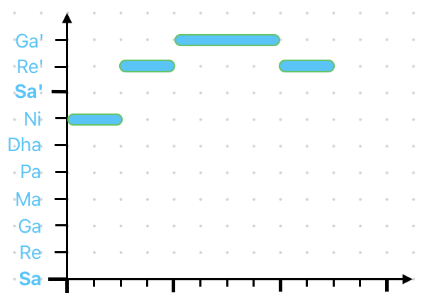 Since we’re mainly concerned with pitch (and scales) for now, we can refer to this phrase by its pitch decoding: Ni Re' Ga' Re'.